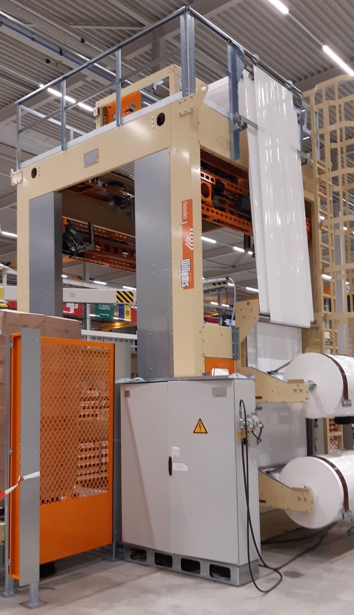 Haubenstretchmaschine Hooder L integriert in bestehende Roboter-Palettierlinie.