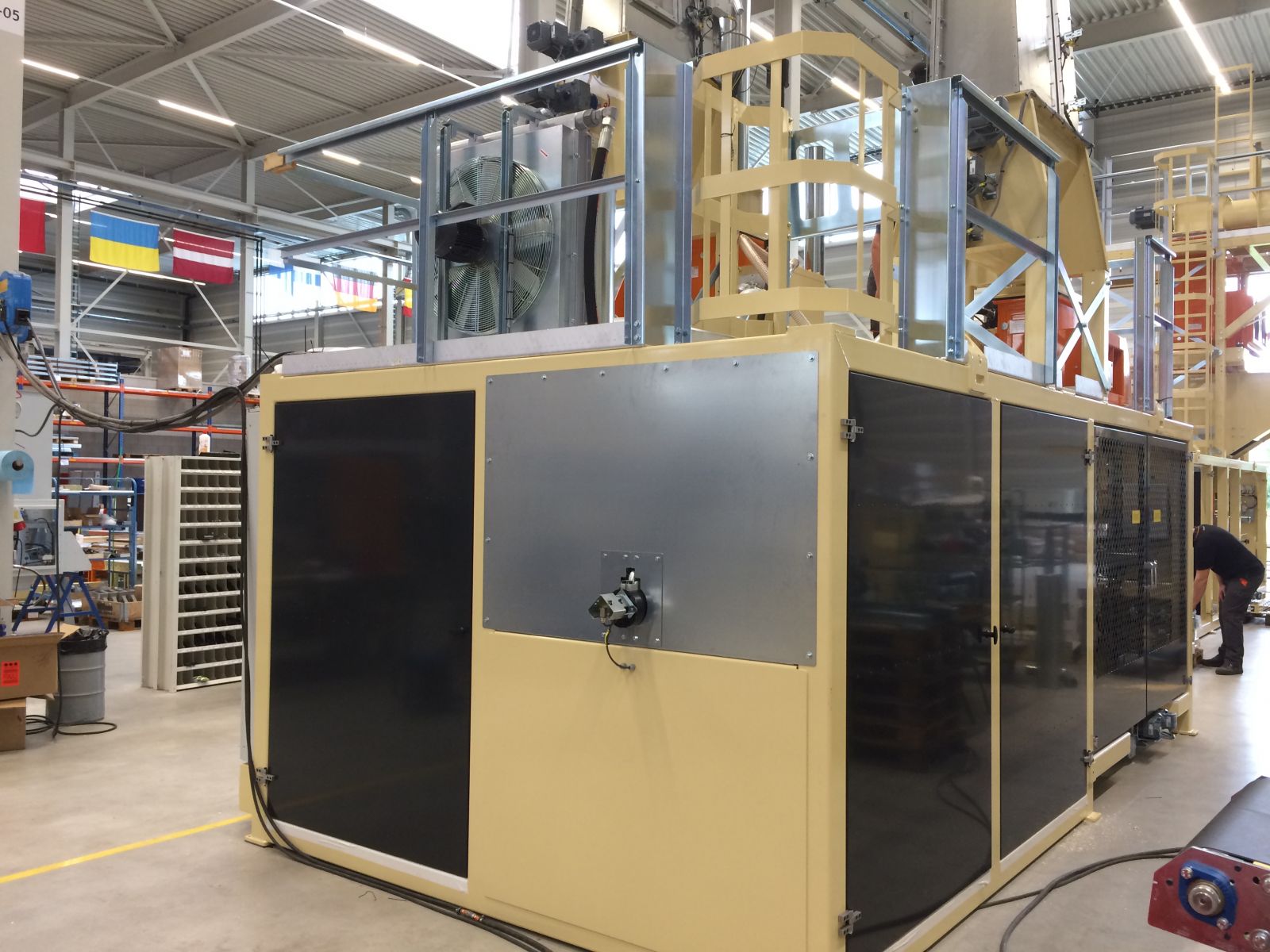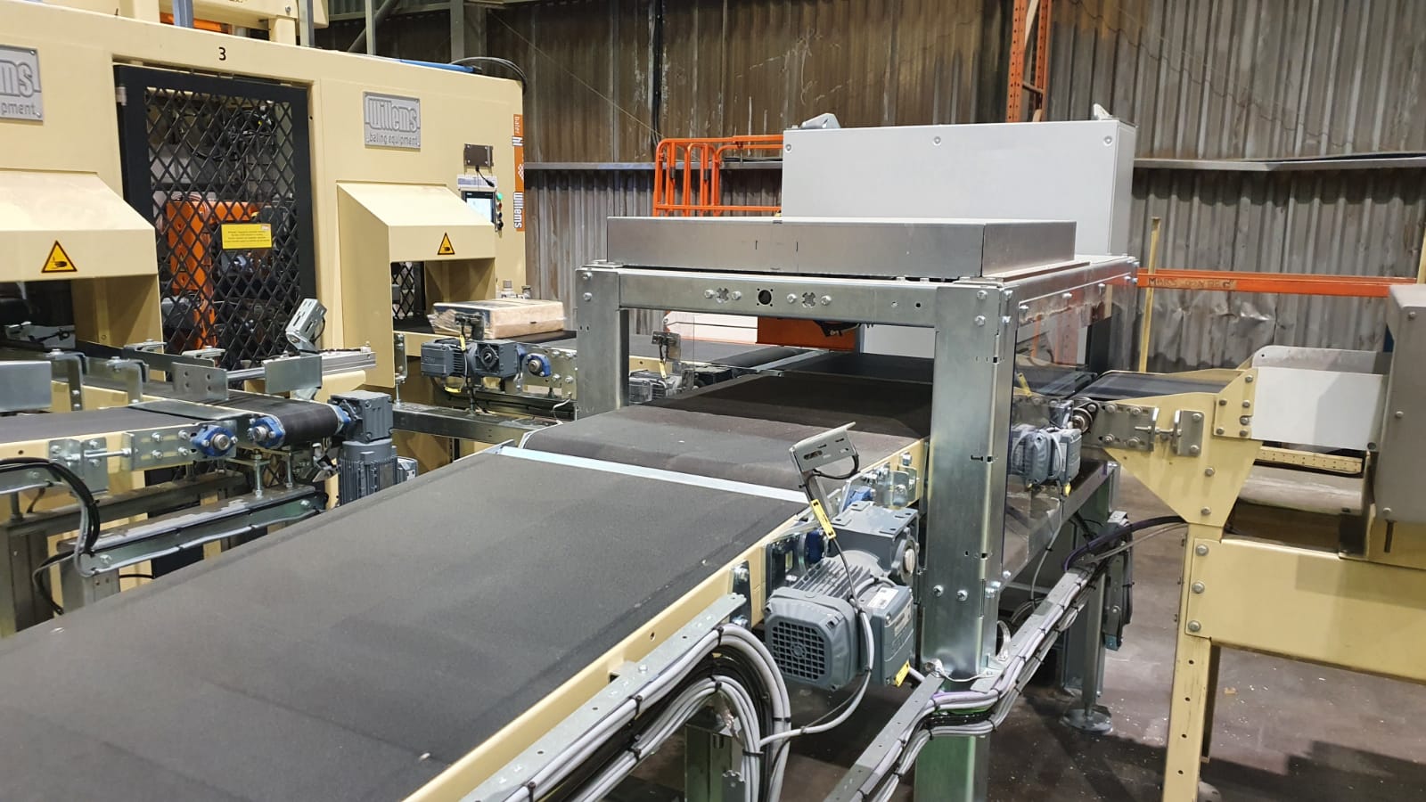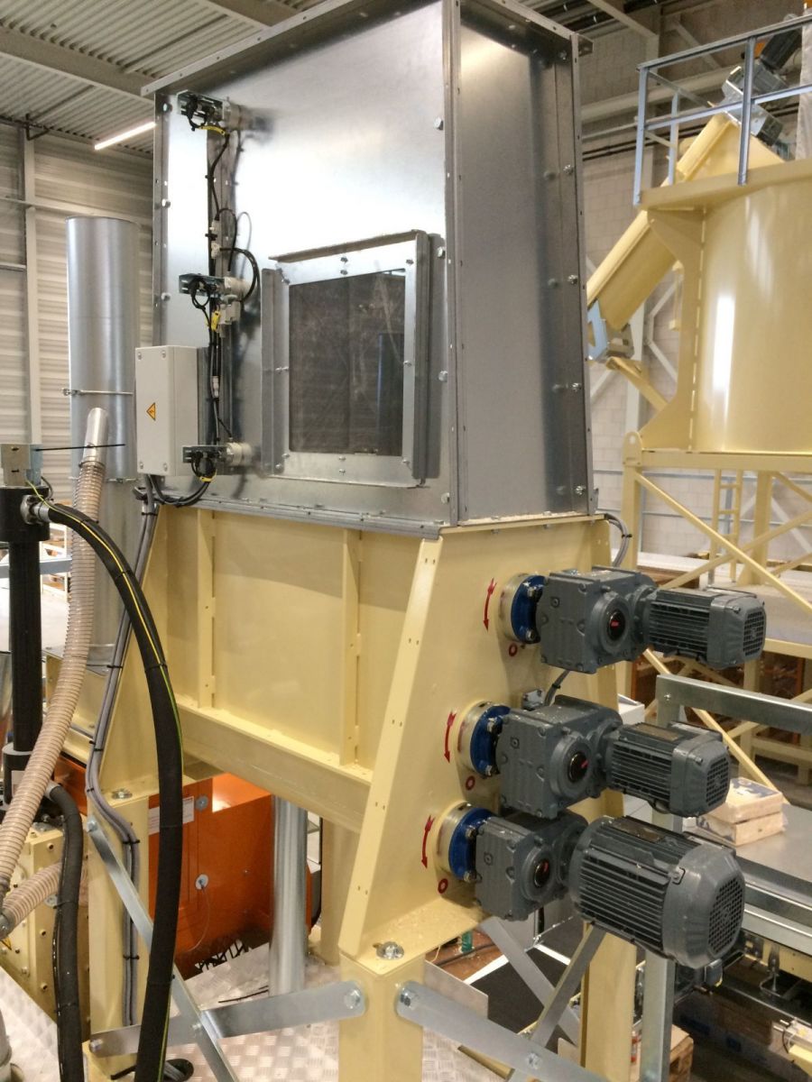 Komplette kleine Verpackungslinie. Die Linie besteht aus der Erweiterung des bestehenden Versorgungssystems, der Doppelballenpresse, der Bündelmaschine und des Roboterpalettierers zum Verpacken von 1400 Ballen pro Stunde. Ballen mit Streu für kleine Haustiere wie Meerschweinchen, Kaninchen und dergleichen.
