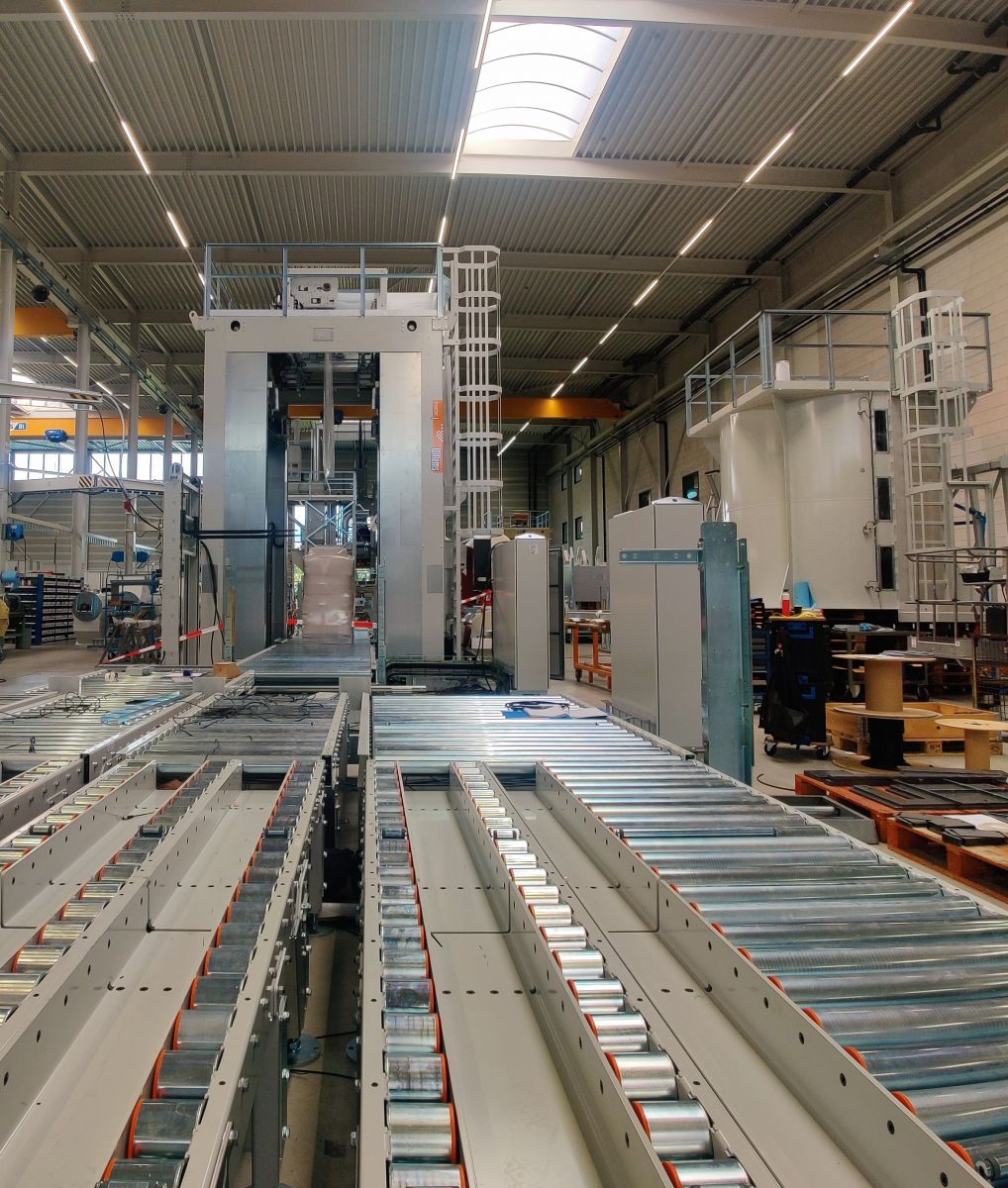 Ein Trommelsieb ist integriert, um die groben Holzspäne von Feinanteilen zu befreien, was bei bestimmten Tierstreuarten erwünscht ist. Die sauberen Späne werden zu Ballen gepresst und in logistisch korrekte Ballen verpackt. Ein Roboterstapelsystem stapelt die Ballen automatisch auf Paletten. Die Stretchhaubenmaschine ist mit 2 Folienrollen ausgestattet, die es dem Hooder L ermöglichen, eine schützende Stretchabdeckung über verschiedene Palettengrößen zu ziehen. Hinter der Haubenstretchmaschine ist ein Palettenpuffersystem platziert.