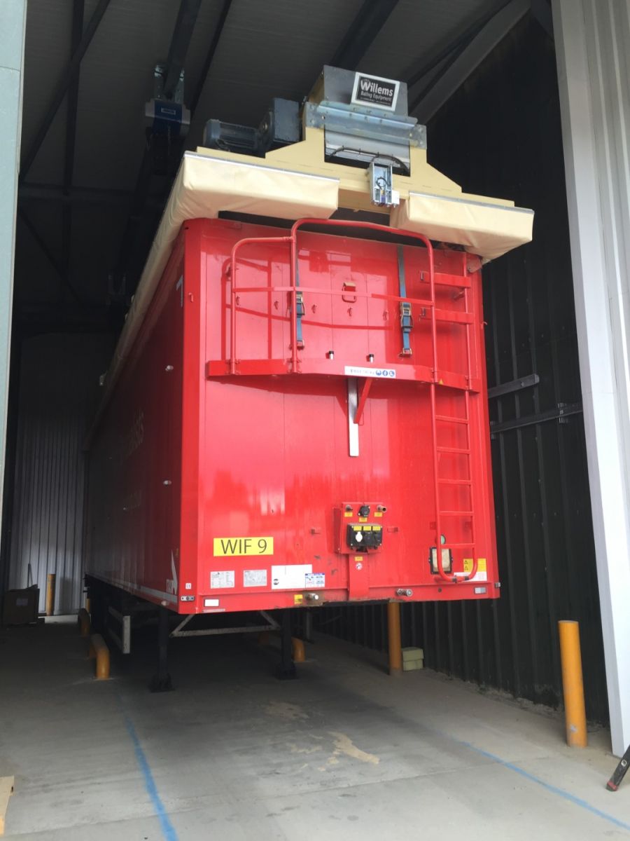 A trailer is placed under the truck. A system is then automatically lowered, ensuring that there is a good seal between the trailer and the filling system. It is then filled with bulk product using a chain conveyor. When the trailer is full, the system stops automatically and the filling system rises again. Afterwards the trailer can be removed again.