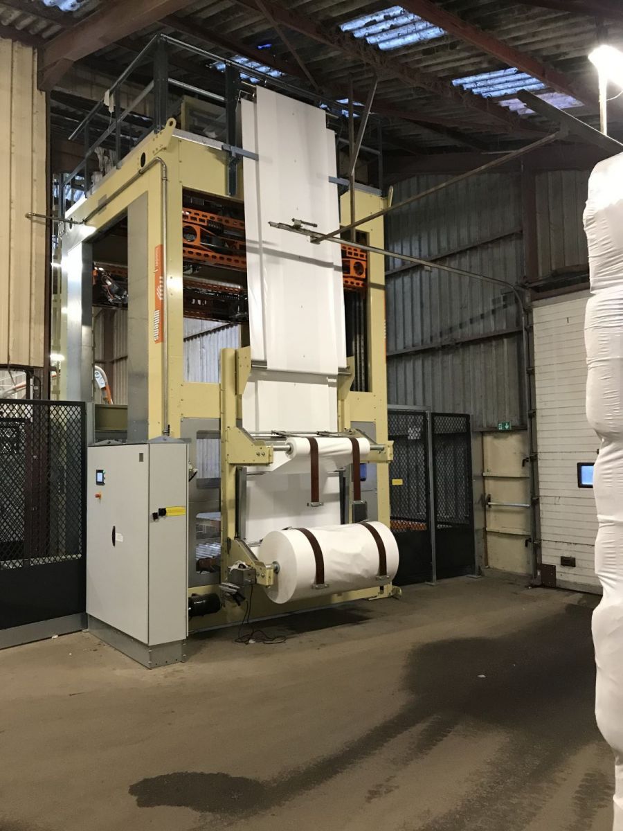 Baler for packaging flax with an extra high compaction. Compared to standard packaging, this means that 28% more fits in a bale of 72 L. In this way, transport costs are saved. The line was delivered with a robot and stretch hood machine. Robot also places plastic sheets on the pallets.