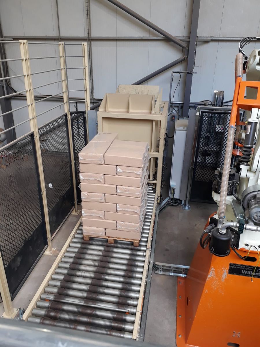 Willems has now delivered 2 balers with 2 robots to press the extremely dusty product into perfect angular bales and pack them fully automatically. With a capacity of 600 bales per hour.