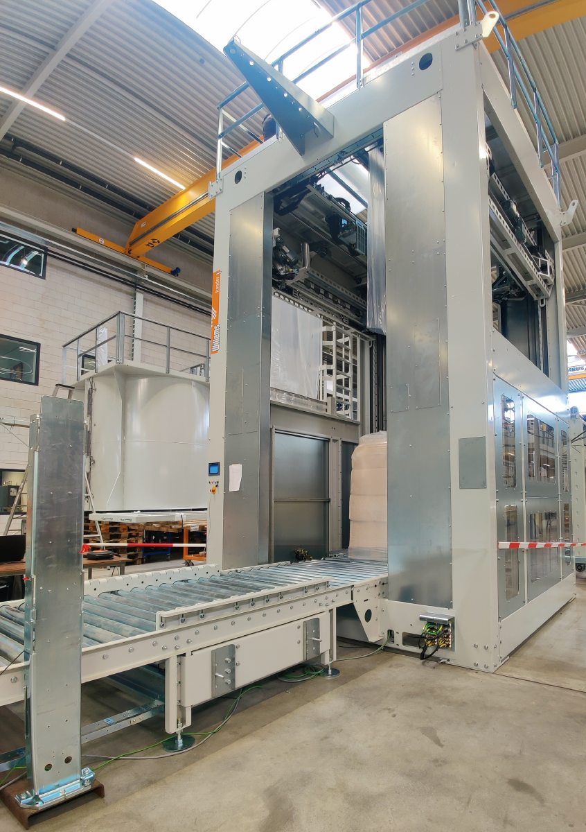 A drum screen is integrated in order to remove the fines from the bigger wood shavings, which is desired for certain types of animal bedding. The clean shavings are baled and packed into proper logistically correct bales. A robot stacking system stacks the bales automatically on pallets. The stretch hood machine is equipped with 2 pieces of film roll, that allows the Hooder L to pull a protective stretch cover over different pallet sizes. A pallet buffer system has been placed behind the stretch hood machine. The roller conveyors are equipped with pallet detectors that check whether pallets are present.