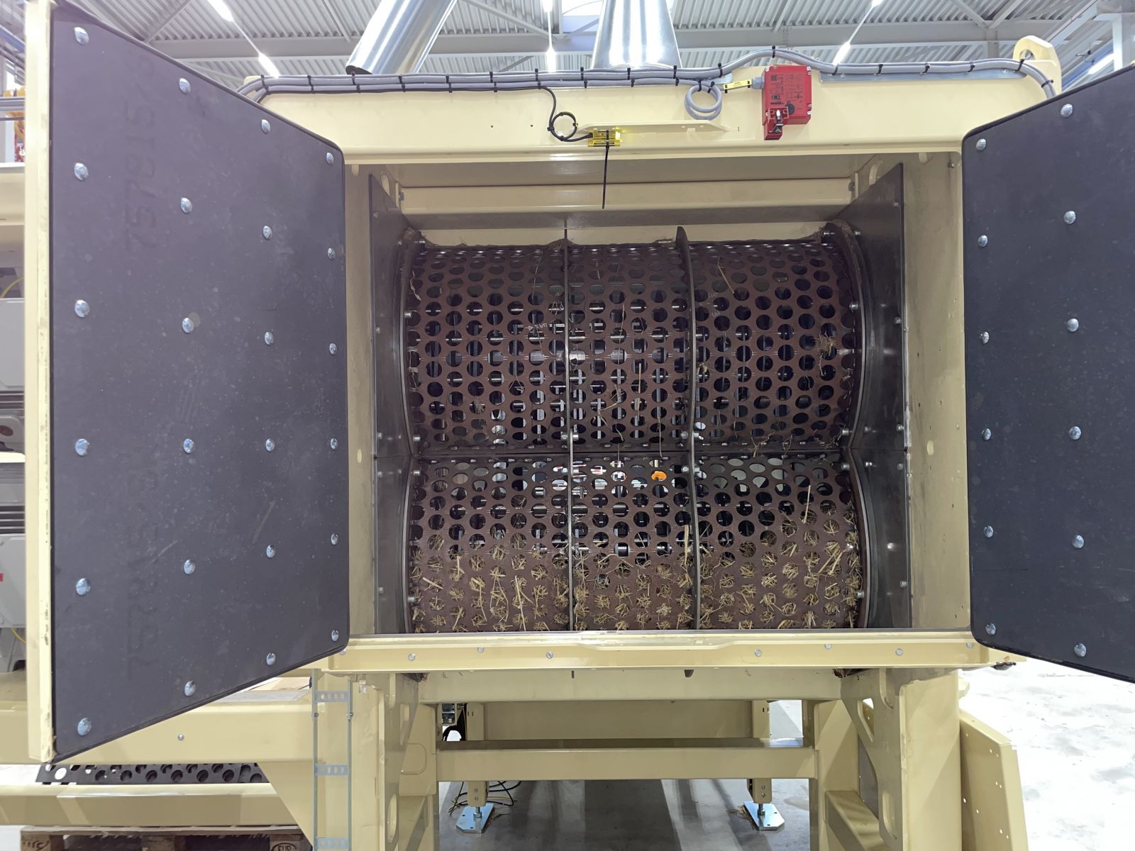 In een twee-fasen-systeem wordt het product eerst door de balen-shredder gehaald, waardoor een losse stroom van materiaal ontstaat. Deze losse stroom wordt vervolgens naar een hamermolen geleid, waar de vezels tot de gewenste lengte worden verkort. Tegelijkertijd worden zwaardere vreemde objecten uit het product gefilterd door een stenenvanger.