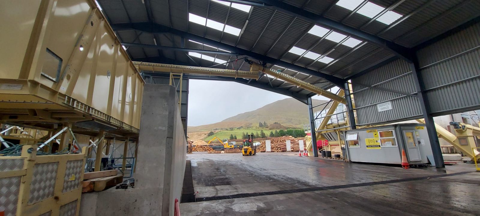 Complete verpakkings- en verwerkingslijn voor houtkrullen. Complete turn key installatie voor bufferen van houtkrullen, 105 m3 bunker met een transportvloer. Deze bunker buffert de houtkrullen, zodat de schaverij met meerdere ploegen kan produceren, terwijl het inpakken slechts in één ploegendienst plaatsvindt. Een trommelzeef is geïntegreerd om de fijnere deeltjes van de grotere houtkrullen te verwijderen, wat voor bepaalde soorten strooisel gewenst is. Het gereinigde schaafsel wordt in balen geperst en verpakt in degelijke logistiek correcte balen. Een robot stapelsysteem stapelt de balen automatisch op pallets. Nadat de balen op de pallet zijn gestapeld, worden ze automatisch door een Willems rekhoesmachine getransporteerd, om de balen te beschermen tegen regen en voor stabiliteit. Wederom een complete turn key fabrieksbouw en gemonteerd door Willems.