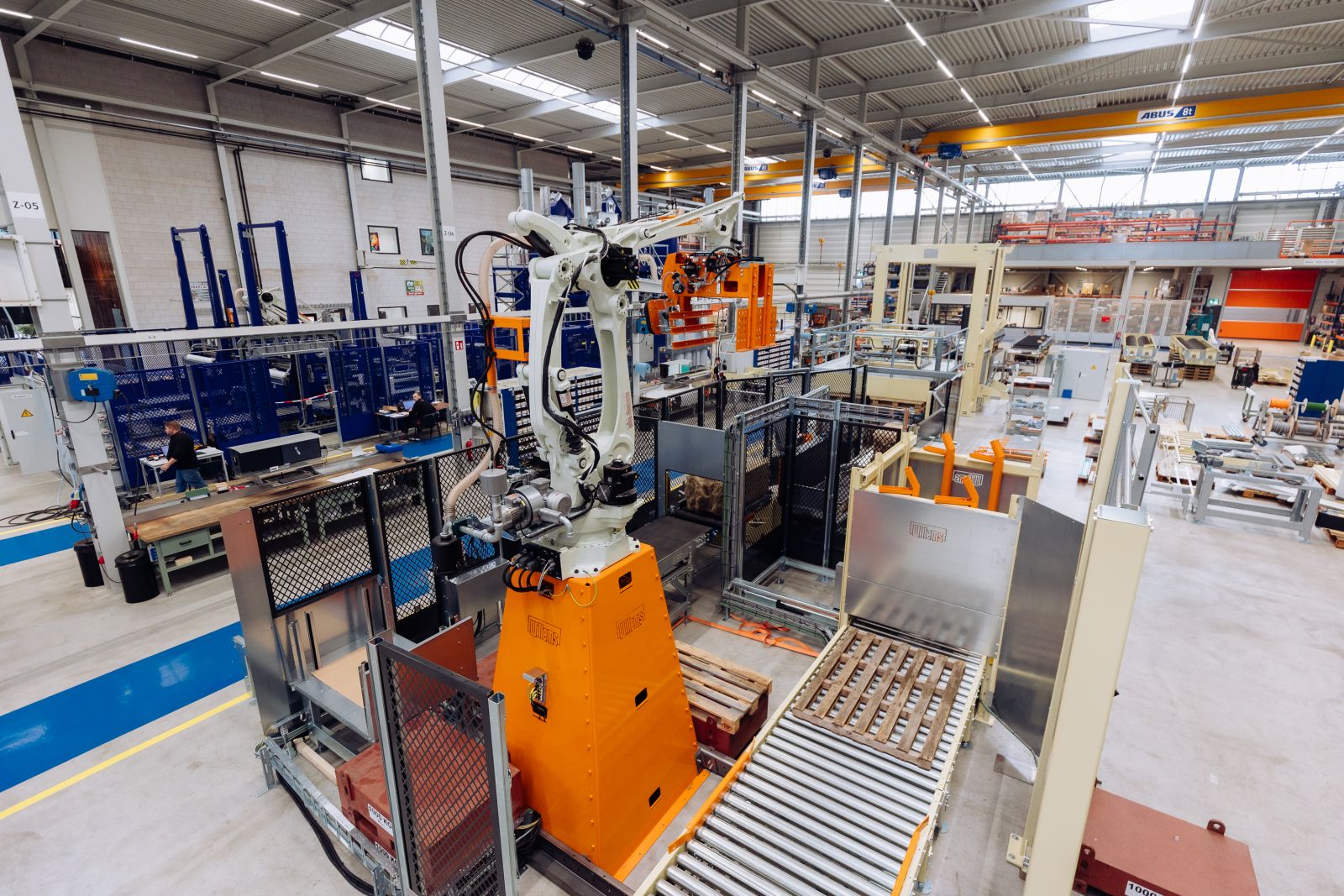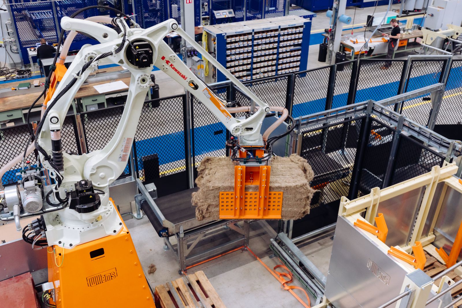 Een klant van Willems heeft tot 250 kilogram balen welke hij graag op een pallet gestapeld zou hebben, wat logistiek veel voordelen oplevert. Dit type robot in combinatie met de hydraulische grijperkop kan zelfs tot 320 kg balen liften. De balen worden ook gewogen en kunnen middels datablock worden uitgelezen door klant ten behoeve van gewichtsregistratie. De balen worden opgepakt middels een robot met hydraulische grijper. Dezelfde grijper heeft een inschakelbare vacuumkop waarmee kartonnen sheets op de pallet gelegd kunnen worden.